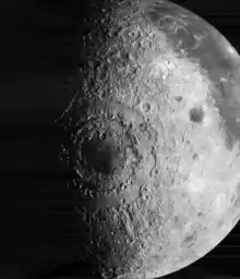 El Mare Orientale es la mancha oscura al centro de la imagen. No se aprecian los anillos exteriores de la cuenca de impacto.