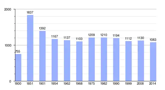 Los datos demográficos contemplados en este gráfico de la comuna de Mareuil[4] se han cogido de 1800 a 1999 de la página francesa EHESS/Cassini, y los demás datos de la página del INSEE.[5]
