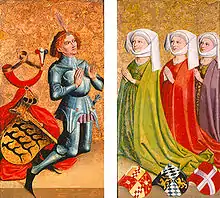 ![]() Margarita de Saboya (extremo de la derecha), representada con su esposo Ulrico V de Wurtemberg y sus dos esposas anteriores. | ||