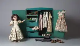 ![]() Modelo de Marilú de c. 1936–1940 junto a su ajuar, fabricada por la firma alemana König & Wernicke. Museo Isaac Fernández Blanco, Buenos Aires. | ||