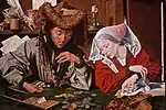 El cambista y su mujer (El tesorero municipal y su mujer) | 1538 | Óleo sobre lienzo, 79 x 112,5 cm | Nantes, Musée des Beaux-Arts | Obra del taller según la base Joconde, Ministère de la Culture.[42] Firmado y fechado en 1538 arriba y a la izquierda según el RKD.[43] | |