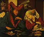 El cambista y su mujer (El tesorero municipal y su mujer) | 1538 | Óleo sobre tabla de roble, 79 x 107 cm | Madrid, Museo Nacional del Prado, en depósito en el Monasterio de El Escorial | Inventario P2102.[40] Firmado y fechado arriba «Reymerswale / Marinus me fecit / aº 1538». El estudio técnico revela que se utilizó un calco para transferir la composición a la tabla y un cambio importante en el tocado de la mujer, que en la primera versión, la que muestra el dibujo subyacente, era más parecido al que se encuentra en uno de los cuadros reproducidos por Frans Francken el Joven en el Banquete en la casa de Nicolas Rockox, alcalde de Amberes, en el que posiblemente estaría reflejada la primera versión, perdida, de esta composición, de la que esta versión del Prado sería la más temprana de las conservadas.[41] | 6 |