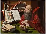 San Jerónimo en su celda | 1533 | Óleo sobre tabla de roble, 69 x 88 cm | Madrid, Real Academia de Bellas Artes de San Fernando | Inv. 611.[31] Firmado y fechado abajo en el borde de la mesa «Opus Marini de Reymerswale • aº • 1533» | 3 |
