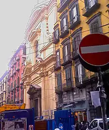 A finales de los años 1940, Gioffredo fue llamado por el rey Carlos III de Borbón para diseñar el Palacio Real de Caserta . El arquitecto fue destituido del cargo y reemplazado por Vanvitelli, que venía directamente de Roma y tenía mucha más experiencia en diseño. El proyecto napolitano consistía en un palacio bastión abaluartado, cerrado a la ciudad, en referencia al Escorial en España y al Palacio de Diocleciano en Split . El proyecto de Vanvitelli era completamente diferente, estaba abierto a espacios abiertos y no cerrado en sí mismo como una fortaleza. Estos propósitos arquitectónicos y urbanísticos concebidos por Vanvitelli, y que difieren completamente de los de Gioffredo, se deben a los resultados de la batalla de Velletri en 1744.