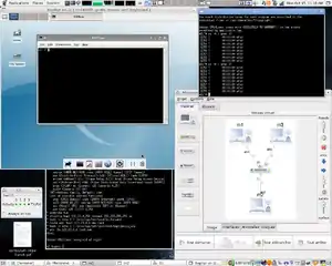 ![]() Simulación de una red en Marionnet. Los hosts pueden iniciar sesiones gráficas. Se muestra una sesión X NEST. | ||