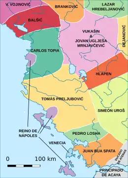 Para 1379, Lazar Hrebeljanović, el señor de la región de Pomoravlje, emergió como el noble más poderoso.[33][40] Aunque se proclamó autocrátor de todos los serbios (самодрьжць вьсѣмь Србьлѥмь), no fue lo suficientemente fuerte como para unir todas las tierras bajo su autoridad. Las familias Balšić y Mrnjavčević, Constantino Dragaš (un Nemanjić por su madre), Vuk Branković y Radoslav Hlapen gobernaban sus feudos sin consultar a Lazar.[33] Además de Marko, Tvrtko I fue coronado rey de los serbios y de Bosnia en 1377 en el monasterio de Mileševa. Relacionado por vía materna con la dinastía Nemanjić, Tvrtko se había apoderado de las porciones occidentales del anterior Imperio serbio en 1373.[41]