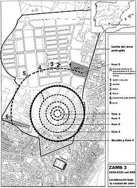 Durante el Calcolítico (principios del III milenio hasta mediados del II milenio a. C.) el asentamiento consistía en una macro-aldea que llegó alcanzar las 35 ha confirmadas mediante excavación y más de 100 estimadas con funciones claramente definidas y aún compartidas (habitacional, defensiva, funeraria, de almacenaje, etc.), donde el reaprovechamiento de estructuras y las remodelaciones serían constantes, lo cual explica la compleja estratigrafía observada. El espacio habitado se organizaba en una serie de anillos concéntricos delimitados por un sistema defensivo de fosos de agua excavados en la base geológica (con sección en U o V), flanqueados en su lado interior con empalizadas de madera y muros de adobe o piedra, presentando a veces bastiones y accesos. El sistema de fosos permitía recoger el agua procedente de los manantiales del Cerro de Santa Catalina (donde se erige hoy día el Castillo de Santa Catalina), facilitando así su distribución hacia las zonas de huerta que quedaban entre los respectivos fosos. Se han llegado a contabilizar hasta cuatro anillos seguros y otros dos probables, con una extensión de 30 ha seguras y 120 ha probables en el caso extremo. De esta forma, el diámetro oscilaría entre los 650 m seguros hasta los 1900 m probables. Aún en la actualidad es posible advertir sobre el plano de Jaén la herencia de la topografía del asentamiento, pues dos vías urbanas (Doctor Eduardo García-Triviño López y Federico Mayor Zaragoza) discurren describiendo una curva, ya que fueron planificadas sobre el antiguo trazado férreo, que aprovechó los terraplenes que la erosión acumuló sobre los restos de las murallas calcolíticas de uno de estos anillos.[1]
