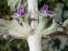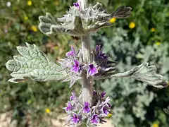 Es una planta herbácea perenne sufruticosa de 20-45 cm de altura, con tallos más o menos cuadrangulares, con abundante indumento blanquecino, frecuentemente lanudo. Las hojas, de 1,5-4 por 1-2cm, son cuneadas, flabeladas, de irregularmente dentadas a lobuladas, algo rugosas por el haz y con nervadura marcada por el envés, con indumento afelpado muy denso, blanquecinas y con pecíolo de 1-3cm, muy largo en las inferiores. Las inflorescencias, de 10-20 cm, están formadas por verticilastros con 12 flores o más cada uno, más o menos próximos, ocasionalmente espiciformes. Las brácteas, de 1-2,5 por 0,8-1,5cm, son sésiles o no. Las flores, sésiles, tienen el cáliz con un tubo de 4-5 mm, lanudo, con 5 nervios anchos y 5 dientes de 2-5 mm, triangulares, punzantes, en la fructificación dispuestos en estrella, patentes, endurecidos, a veces los 2 inferiores algo más largos; mientras la corola, de 4-5 mm, esa de color púrpura, con márgenes blanquecinos, el labio superior bífido, estrecho, erecto, y el inferior con 2 lóbulos laterales cortos y estrechos, el central mayor, semiorbicular, a veces emarginado, todos muy pelosos por fuera. Los frutos son esquizocárpicos en tetranúculas, con mericarpos de color castaño, de 2-2,5 por 1-1,5 mm, elipsoides, aplanados, con ápice agudo y una coronilla de pelillos en la base.[1]