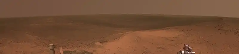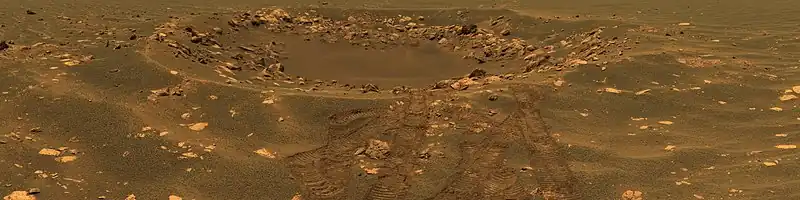 El interior de un cráter que rodea el Opportunity en Meridiani Planum se puede ver en esta imagen en color de la cámara panorámica del robot. Era el lugar de desembarco más oscuro visitado por una nave espacial en Marte. El margen del cráter estaba a unos 10 m del robot. El cráter donde se halla el robot tiene 21 m de diámetro × 3 m de profundidad.[34]