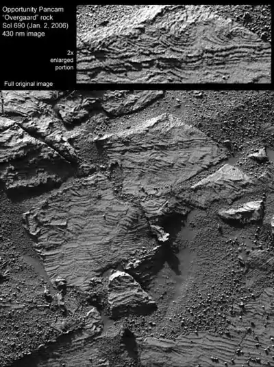 El afloramiento de rocas cerca del Opportunity lo captó la cámara en la primera panorámica y es la primera roca desnuda que se ve sobre Marte. Los científicos creen que las piedras surgieron en esta zona y o bien son depósitos de ceniza volcánica o sedimentos formados por viento o agua, lo que constituye un "Cofre del tesoro" geológico. Se le llamó Opportunity Ledge porque estas rocas estratificadas a solo 8 m del Opportunity constituyen una oportunidad única.[36] Estas rocas surgieron en la zona y no como en el caso del Spirit.