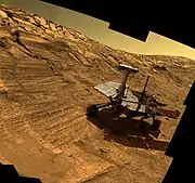 Opportunity, también conocido como MER-B (Mars Exploration Rover – B) o MER-1,[9][10][11] es un robot rover en el planeta Marte activo desde 2004 hasta 2018. Fue el segundo de los dos vehículos robóticos de la NASA que aterrizaron con éxito en el planeta Marte en 2004.[12] El vehículo aterrizó el 25 de enero de 2004 a las 05:05 TUC, MSD 46236 14:35 AMT, 18 Scorpius 209 Dariano. Su gemelo, MER-A (Spirit), había aterrizado en Marte tres semanas antes, el 3 de enero de 2004.[13] Ambos robots forman parte del 'Programa de Exploración de Marte' de la NASA.