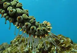 ![]() Detalle del extremo de un brazo mostrando los pies ambulacrales y las espinas de la epidermis | ||