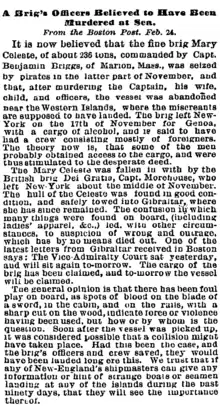 - Dos periódicos británicos publicados en febrero de 1873, The Times y The Manchester Guardian, contenían informes que mencionaban las supuestas manchas de sangre y la apariencia de violencia.[111][112] The Boston Post del 24 de febrero expresó la opinión de que la tripulación, «sobre todo de extranjeros», tomó el alcohol y posteriormente asesinó a Briggs, a su esposa, a su hija y a los oficiales, antes de escapar a las «islas Occidentales».[113]El 24 de marzo el Departamento del Tesoro de Estados Unidos escribió en una circular de la «sospecha grave» de asesinato cometido por la tripulación presa de la furia causada por la borrachera.[114]