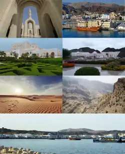 ![]() De izquierda a derecha y de arriba abajo: La Gran Mezquita del Sultán Qabus, vista de edificios clásicos de la ciudad, la Ópera Real de Mascate, el Palacio de Al Alam, región del desierto del Golfo, Montañas Al Hayar y el Puerto Sultán Qabus.