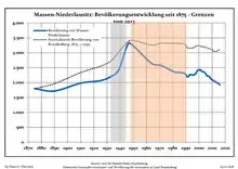 Desarrollo de la población en los actuales límites (Línea azul: Habitantes -- Línea de puntos: Comparación con el desarrollo de Brandenburgo; Fondo gris: Período del gobierno nazi -- Fondo Rojo: Época communista)