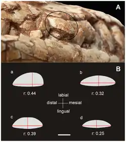 ![]() Dientes maxilares de masópodos basales: Leyesaurus (a), Adeopapposaurus (b), Massospondylus (c), y Riojasaurus (d) | ||