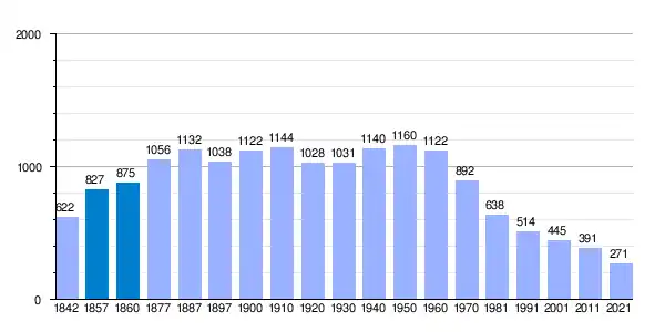 | Gráfica de evolución demográfica de Masueco[11] entre 1842 y 2021 |