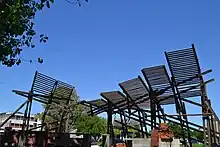 - Plaza del Agua y Mercado de Pescadores en Bajada Colacho :[10][11] Fue un trabajo de vinculación socio comunitaria con veinte familias que se dedican a la pesca y que habitan el lugar en forma precaria. Ubicada entre la cota alta y la cota baja de la barranca, en un terreno de propiedad del estado, la plaza y mercado se configuran a partir de una serie de vigas de hormigón zigzagueantes entre los árboles que enmarcan el paisaje y constituyen un lugar de encuentro a la sombra, al mismo tiempo que proveen de agua potable e infraestructura para la comercialización del pescado. Institución: Comuna de Pueblo Esther Ubicación: Bajada Colacho, Pueblo Esther Año: 2014-2016
