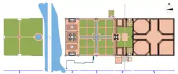 El complejo del Taj Mahal se dispuso en una cuadrícula, subdividida en cuadrículas más pequeñas. Los historiadores de la arquitectura Koch y Barraud están de acuerdo con los relatos tradicionales que dan el ancho del complejo como de 374 yardas mogoles o gaz,[84] estando el área principal compuesta por tres cuadrados de 374 gaz de lado. Cada uno se subdividió en áreas como el bazar y el caravasar en módulos de 17 gaz; el jardín y las terrazas están en módulos de 23 gaz y tienen 368 gaz de ancho (16x23). El mausoleo, la mezquita y la casa de huéspedes se distribuyen en una cuadrícula de 7 gaz. Koch y Barraud observan que si a un octágono, usado repetidamente en el complejo, se le dan lados de 7 unidades, entonces tiene un ancho de 17 unidades,[85] lo que puede ayudar a explicar la elección de las proporciones en el complejo.[86]