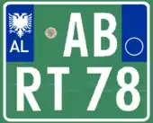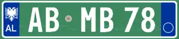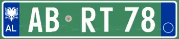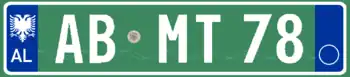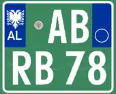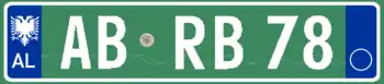 La matrícula está configurada de la siguiente manera. A la izquierda se encuentra, en rojo, la señal que indica que el vehículo pertenece a Albania más la sigla "AL". Luego hay dos letras que corresponden a la región del vehículo. A continuación va una serie de 4 dígitos, y por último una letra que corresponde al año. Las letras O y Q no se utilizan por posibles equivocaciones. La Z se usa para vehículos del gobierno.