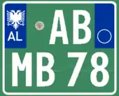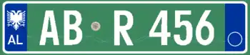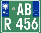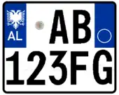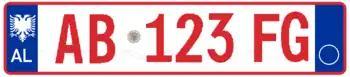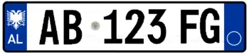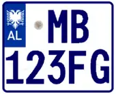 Desde el 16 de febrero de 2011 se ha introducido un nuevo formato similar a los diseños de placas italianos posteriores a 1994 y franceses posteriores a 2009.[1] Las placas comienzan con una franja azul a la izquierda con 'AL' y águila bicéfala rediseñada en blanco, 2 letras seriales, holograma de seguridad, 3 dígitos, 2 letras seriales sobre un fondo blanco rectangular, y terminan en el a la derecha con una franja azul que se supone que muestra el año de registro y el código regional en blanco. Se ha observado que los dos últimos elementos de identificación no están incluidos de facto, mientras que la fuente está más enfatizada que la posterior a 2002.[2] Plates of all vehicles would experience a similar change.[3] Los críticos afirman que el color del águila bicéfala y la franja no son representativos de los colores rojo y negro de la bandera albanesa. Las placas de vehículos privados tienen bordes negros y textos negros sobre un fondo blanco. Siguen un formato [AB 123 FG]. Este formato es nacional, independientemente del distrito de matriculación del vehículo.