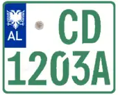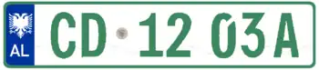 Las placas de matrícula de vehículos del cuerpo diplomático en Albania tienen bordes verdes y textos verdes sobre un fondo blanco. No tienen la franja azul en el lado derecho de la placa, a diferencia de las placas de matrícula de vehículos privados. Siguen el formato [CD 00 00A], donde CD significa corps Diplomatique. Los primeros 2 dígitos de la matrícula se refieren a los códigos de matrícula diplomáticos (explicados más adelante en el artículo). Por ejemplo, el código 01 pertenece al cuerpo diplomático de Austria mientras que el código 41 se refiere al cuerpo diplomático de la Unión Europea.