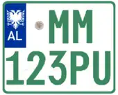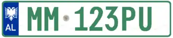 Las placas de matrícula de vehículos militares en Albania tienen bordes verdes y textos verdes sobre un fondo blanco. Siguen el formato [MM 000PU], donde MM significa Ministria e Mbrojtjes, que significa Ministerio de Defensa. Los dos últimos dígitos pueden ser las siguientes combinaciones: