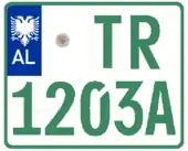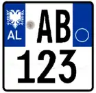 Las motocicletas privadas en Albania tienen un formato de matrícula [AA 000]. La placa de matrícula de motocicleta en Albania tiene un tamaño de 212 mm por 205 mm y tiene texto negro y bordes negros sobre un fondo blanco.