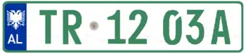 Las placas de matrícula de los vehículos del servicio diplomático en Albania tienen bordes verdes y textos verdes sobre un fondo blanco. No tienen la franja azul en el lado derecho de la placa, a diferencia de las placas de matrícula de vehículos privados. Siguen el formato [TD 00 00A], donde TD significa Truput Diplomatic, que significa "Cuerpo Diplomático" en albanés. Los primeros 2 dígitos de la matrícula se refieren a los códigos de matrícula diplomáticos.
