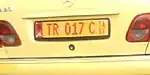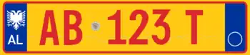 Las placas de matrícula de los taxis en Albania tienen bordes rojos y textos rojos sobre un fondo amarillo. Siguen el formato [AA 000 T], donde T significa Taxi.