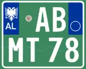 Las placas de matrícula de vehículos tecnológicos en Albania tienen bordes blancos y textos blancos sobre un fondo verde. Siguen el formato [AA MT 00], donde MT significa Makinë Teknologjike que significa Vehículo Tecnológico.