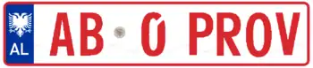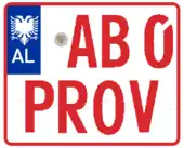 Las placas de matrícula del vehículo de prueba en Albania tienen bordes rojos y textos rojos sobre un fondo blanco. Siguen el formato [AA 0 PROV], donde PROV significa Provë que significa Prueba.