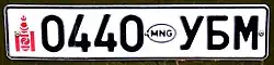 Las matrículas usadas en Mongolia generalmente hacen uso de un fondo de color blanco y una tipografía de color negro. Los códigos usados se escriben en una o dos líneas, siendo las de una línea de tamaño similar al europeo estándar, de 520 por 110 milímetros. Las diferentes combinaciones posibles se componen de un total de cuatro cifras, seguidas de tres caracteres cirílicos, siendo las dos primeras las indicadoras de la zona en la que se ha registrado la matrícula. Recientemente se ha añadido al borde izquierdo un símbolo soyombo de color rojo; y un pictograma ovalado con los caracteres MNG en su interior (Anteriormente MGL),[1] que sirve como separación entre el grupo de cifras y el de letras. Las matrículas más antiguas carecen de estos símbolos. Las matrículas correspondientes al cuerpo diplomático comienzan por los caracteres ДК, de color blanco sobre un fondo rojo, y se completan con dos grupos de dos dígitos.