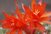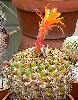 Es una planta perenne carnosa, globosa-cilíndrica con las hojas de color verde, armada de espinas y con las flores de color naranja, rojo y púrpura.