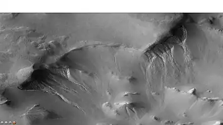 Los "gullies" son pequeñas redes de estrechos cauces incisos (asociados a zonas en pendiente y al arrastre y a la formación de depósitos de sedimentos), característicos del planeta Marte. Normalmente presentan forma de "reloj de arena", con una cabecera ramificada que se concentra en un corto cauce principal, para volver a abrirse en cuanto la pendiente del terreno se reduce.[2] Se han barajado diversas teorías para darles una explicación (inicialmente ligadas a ciclos de helada y deshielo del agua), pero la hipótesis más plausible es la que los liga al movimiento de sedimentos en polvo ligados a ciclos de solidificación y vaporización del hielo seco producido por la congelación del dióxido de carbono.[3][4][5] Estos fenómenos han sido observados prolongadamente en varios lugares, como el cráter Gasa.[6]