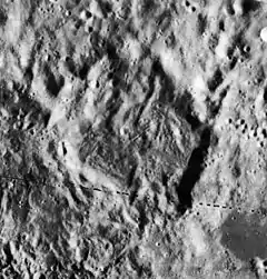 Este es un cráter que ha sido casi borrado por una intensa historia de impactos, dejando solo un remanente desintegrado del brocal original. El borde externo que sobrevive no es especialmente circular, habiendo sido remodelado en un esquema vagamente pentagonal. Presenta grietas profundas producidas por otros cráteres al noreste. El suelo interior no presenta un estado mucho mejor, siendo áspero e irregular.