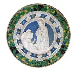 Las pruebas sobre este tipo de decoración se realizaron en Europa a partir del siglo XII, pero fue en el siglo XIV cuando la mayólica tuvo una gran producción en Faenza y más tarde en Delft (siglo XVII), con una elaboración a gran escala.[21] El artista italiano del quattrocento Lucca de la Robbia, aplicó en su esculturas una base de barniz de estaño con una cubierta de barniz brillante, con este sistema los colores a emplear se disminuyen, ya que existe una resistencia durante la cocción. La gama empleada por Della Robbia era casi exclusivamente el verde y el azul sobre el blanco, con el tiempo y por diversos experimentos fue adoptando otros colores.[22]