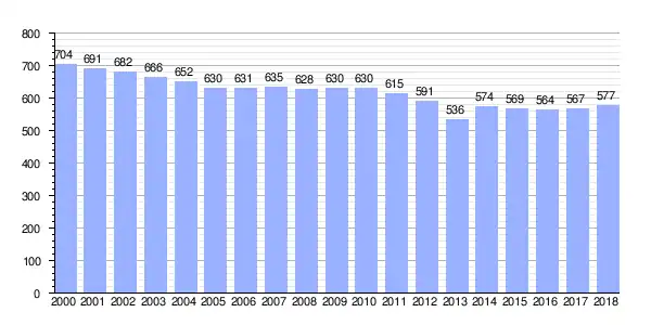 | Gráfica de evolución demográfica de Mazaricos[2] entre 2000 y 2018 |
