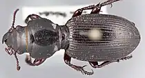 Su longitud es 14,6–19,5 mm, anchura pronotal de 4,2–6,2 mm y elitral de 5,1–7,1 mm. El color de todo el cuerpo varía de marrón rojizo mate a negro mate.[2]