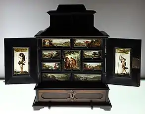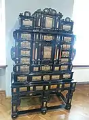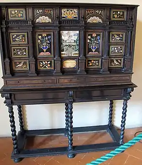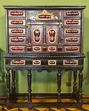 - En el Palacio de los Normandos, Palermo, hay un medallero siciliano del siglo XVII en dos cuerpos, de madera lacada en negro con pinturas de vidrio, marquetería de concha de tortuga, bronces y las columnas retorcidas en lacado de tortuga falsa.