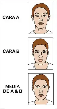 Muchos estudios, utilizando diferentes técnicas de promediación, incluido el uso de dibujos lineales[15] y perfiles de caras[16] han demostrado que este es un principio general: las caras promedio son consistentemente más atractivas que las caras utilizadas para generarlas.[17][18][19][20] Además, si una cara compuesta femenina (promediada) hecha de 32 caras diferentes se superpone con la cara de un modelo femenino extremadamente atractivo, las dos imágenes a menudo se alinean estrechamente, lo que indica que la configuración facial del modelo es muy similar a la del rostro compuesto.[21] Véase por ejemplo, la ilustración de Jessica Alba a la derecha.