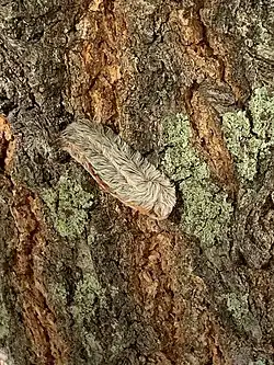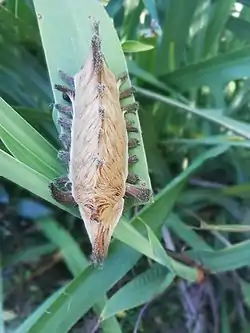 La larva de 3 cm de largo está bastante cubierta de largas y densas setas parecidas a pelos, lo que la hace parecerse a un pequeño gato persa. Es de color variable, desde blanco grisáceo a marrón dorado o gris oscuro.[10] A menudo tiene una veta de color naranja brillante que se extiende longitudinalmente. El "pelaje" en las larvas del primer estadio es a veces extremadamente rizado, dando a la larva un aspecto algodonoso e hinchado. El cuerpo se estrecha hacia una cola que se extiende más allá del cuerpo, a diferencia de su pariente M. crispata.[11] El estadio intermedio tiene una apariencia más desaliñada, sin una cola distintiva. El "pelaje" de la larva contiene espinas venenosas que causan reacciones extremadamente dolorosas en la piel humana al contacto.[2][12][10] La polilla adulta está cubierta por un pelaje largo en colores que van desde el naranja apagado hasta el amarillo limón, con patas peludas y patas negras vellosas.