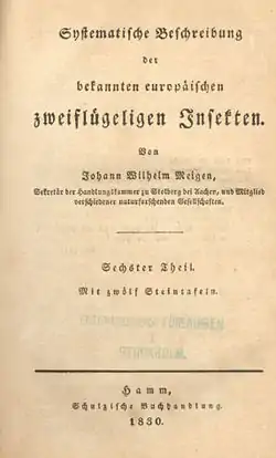 - Meigen, J. W., 1818-1838 Systematische Beschreibung der bekannten europäischen zweiflügeligenInsekten en descripción inglesa , Sistemática del europeo sabido dos-winged insectos. Esto es un trabajo de siete volúmenes . El primer volumen estuvo publicado en 1818, el último en 1838.