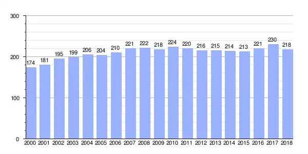 | Gráfica de evolución demográfica de Meijigo entre 2000 y 2018 |