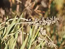 Las flores son de color blanco a color crema y están dispuestas en espigas en los extremos de las ramas que siguen creciendo después de la floración. Las inflorescencias son de hasta 12 milímetros de diámetro, 60 milímetros de largo y con entre 10 a 30 flores individuales. Los pétalos se disponen en cinco bultos alrededor de la flor con 15 a 35 estambres por paquete. La época de floración es variable, pero a menudo se produce en invierno. Los frutos que le siguen son cápsulas leñosas de 2.2-3.5 milímetros de largo dispuestas en racimos más o menos esféricos alrededor del tallo.[1][2][3]