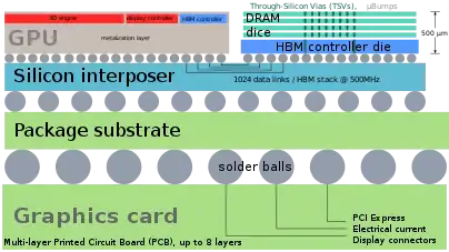 HBM logra un mayor ancho de banda mientras usa menos energía en un factor de forma sustancialmente más pequeño que DDR4 o GDDR5.[5] Esto se logra apilando hasta ocho matrices DRAM (por lo tanto, es un circuito integrado tridimensional), incluida una matriz base opcional (a menudo un intermediador de silicio[6][7]) con un controlador de memoria, que están interconectados por vías a través de silicio (TSV) y microbolas de soldadura. La tecnología HBM es similar en principio pero incompatible con la interfaz Hybrid Memory Cube desarrollada por Micron Technology.[8]