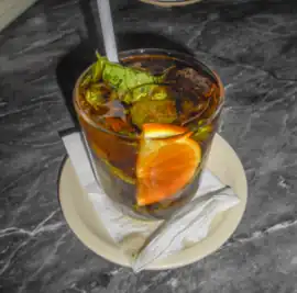 | Preparación | Con un mortero, machaque las hojas de menta con el azúcar en una coctelera. Agregue los ingredientes restantes y agite vigorosamente. Sirva en copa martinera o vaso de rocas, y adorne con hojas de menta.[nota 1] | |