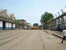 Un transeúnte dentro del taller de Golden Rock Railway en India.
