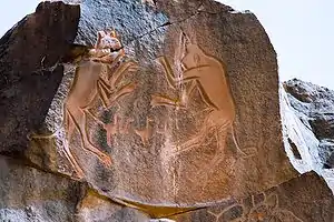 Graziosi encuentra numerosos grabados en los que se suceden varias fases. En la primera, se encuentran figuras míticas con cabeza de animal, seguida de una fase pastoral, en que aparecen animales domésticos, con collares y pendientes, y también escenas de caza, con rinocerontes y elefantes. También aparecen escenas de caza con caballos, y posteriormente se entra en la fase del camello.