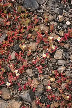 Muestra tallos de 2-22 cm, erguidos o decumbentes, muy ramificados desde la base, carnosos. Sus hojas son subcilíndricas y papilosas, verdes al principio y rojizas o purpúreas en la madurez, de 1-4 cm de longitud y 1-2 mm de ancho, basales opuestas y superiores alternas. Flores solitarias blancas de 1 cm de diámetro, de sépalos desiguales, crasos, papilosos, y pétalos de aproximadamente el mismo tamaño que los sépalos, blancos o amarillos. Anteras amarillas. Semillas de 0,8-1 por 0,5-0,6 mm, triangulares o semicirculares, de color pardo-rojizas, verrugosas.